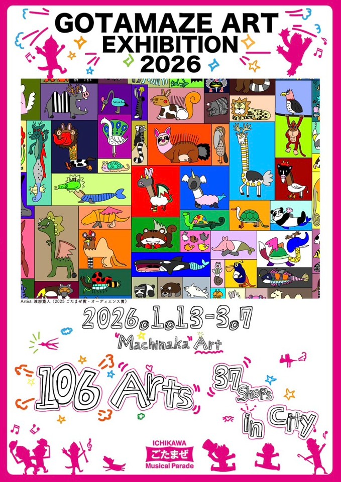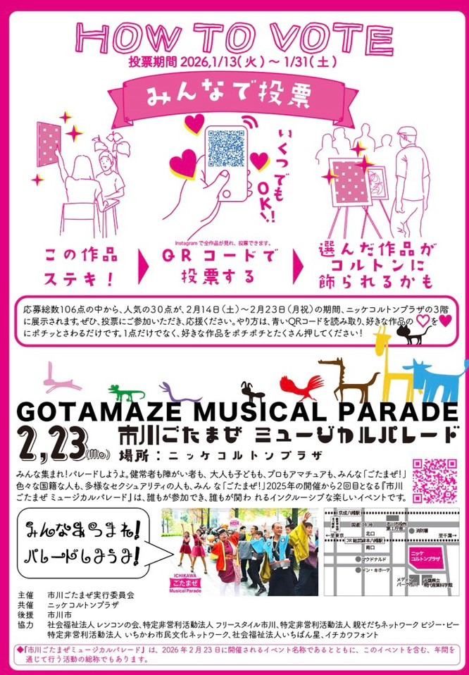 先般お知らせしました通り、「第2回市川ごたまぜミュージカルパレード」を2026年2月23日(祝・月)に開催します。「第2回ごたまぜアート展」は、「第2回市川ごたまぜミュージカルパレード」と同時開催のアートイベントです。2月23日には、アート授賞式も行いますので、ご自身が投票した作品がコルトンプラザ3階に展示されているかどうかを見に来ていただき、授賞式の様子も見てください!